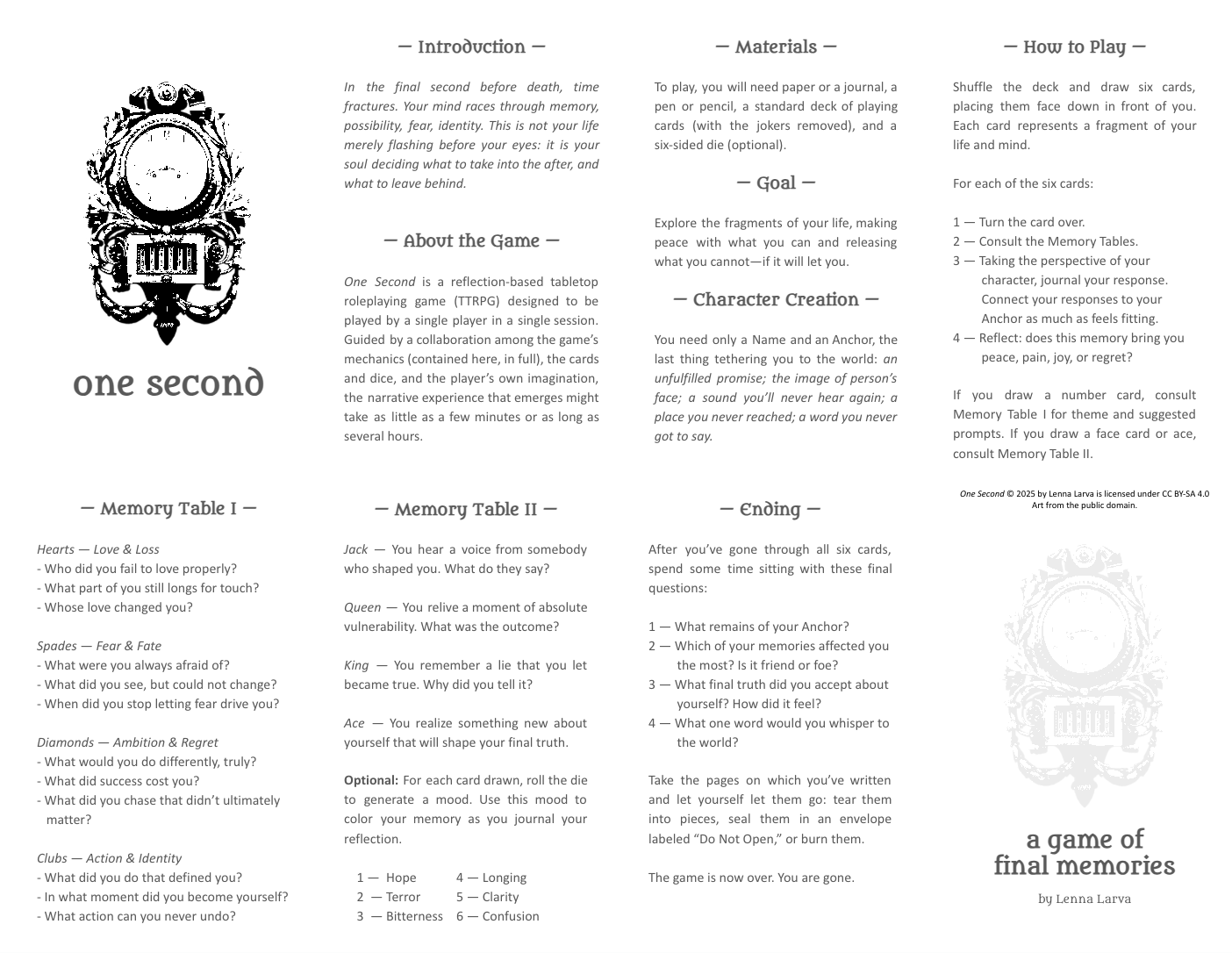 A solo reflection TTRPG about final memories. Suggested for mature audiences. Available in both one-page and foldable mini-zine versions.